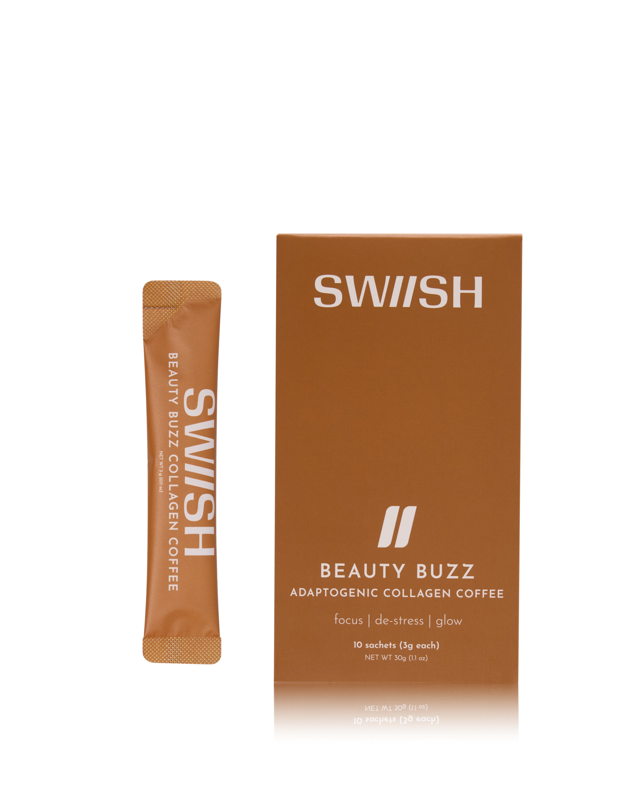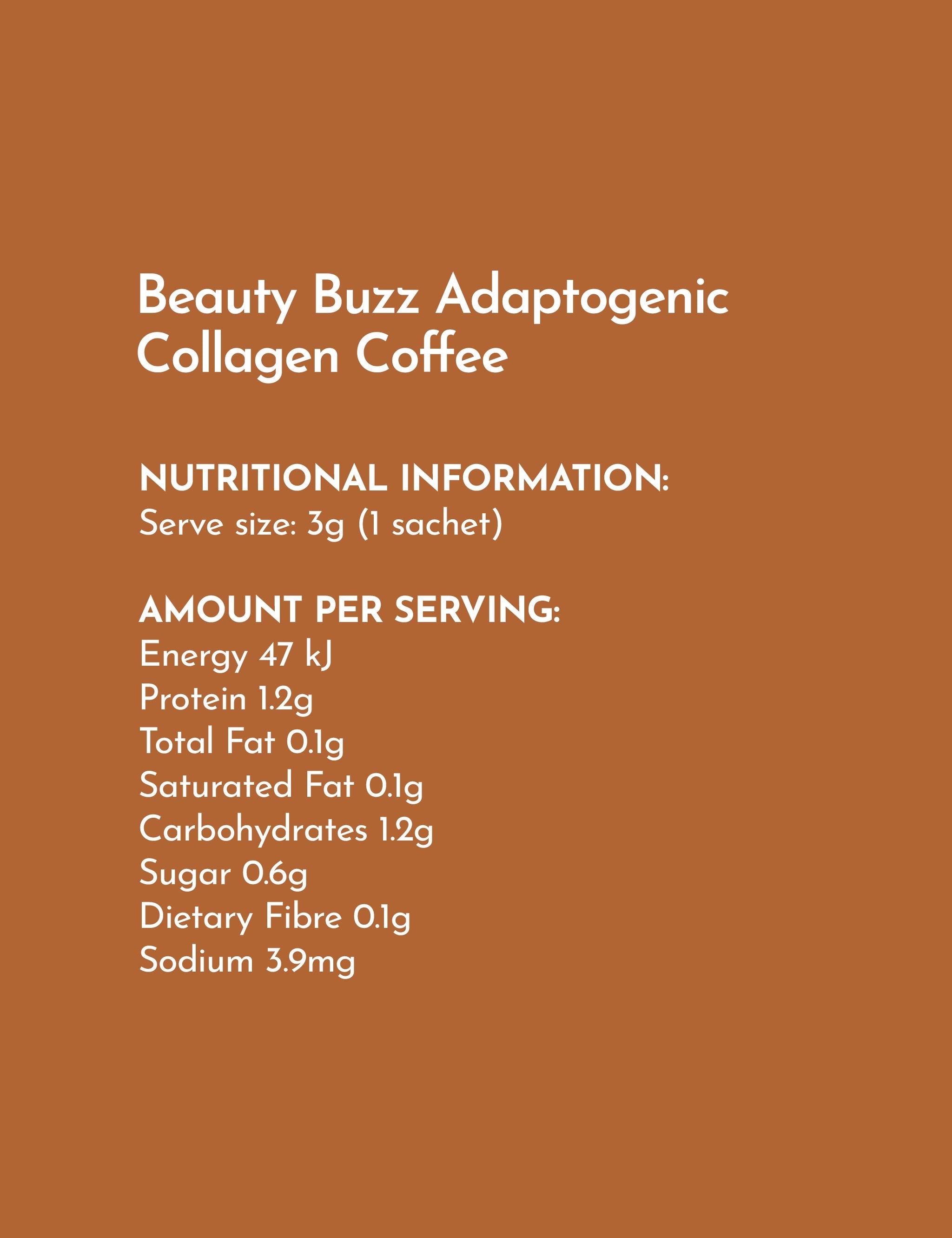 BEAUTY BUZZ was designed to help improve cognitive function, sustain focus and mental clarity, regulate and de-stress your nervous system, and support skin strength, hydration and elasticity. In a single–serve of BEAUTY BUZZ, the carefully formulated coffee–to–adaptogen ratio means that the caffeine, collagen and all–natural adaptogens will work to synergistically supercharge your wellbeing from the inside out.