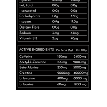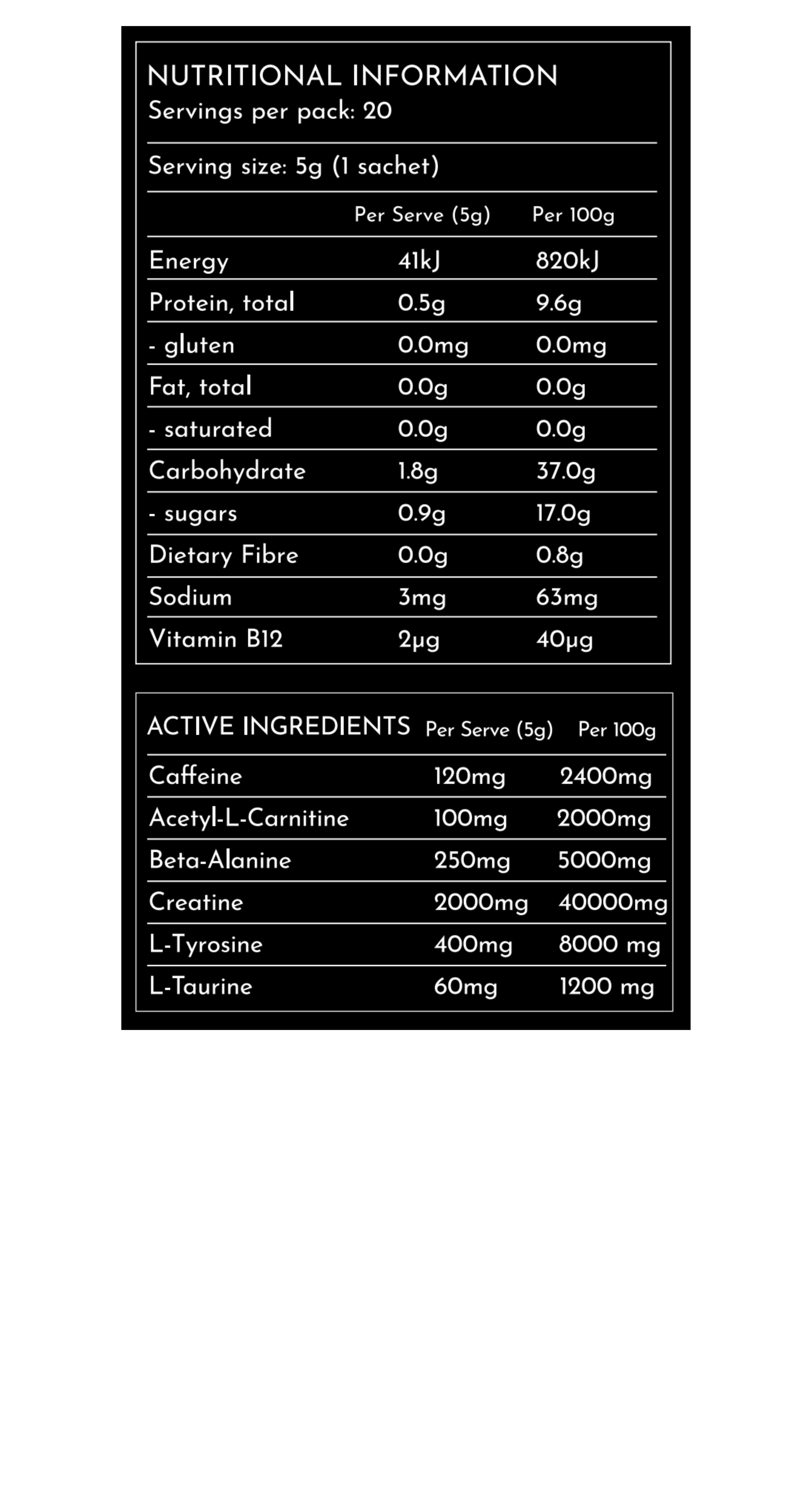 ACTIVE BLEND: (Creatine Monohydrate, Beta Alanine, L-Taurine, Acetyl-L-Carnitine, L-Tyrosine, Guarana Extract, Green Tea Extract), Natural Flavours, Beetroot, Acidity Regulator (Citric Acid), Natural Sweeteners (Thaumatin, Steviol Glycosides), Vitamin B12 (Cyanocobalamin).