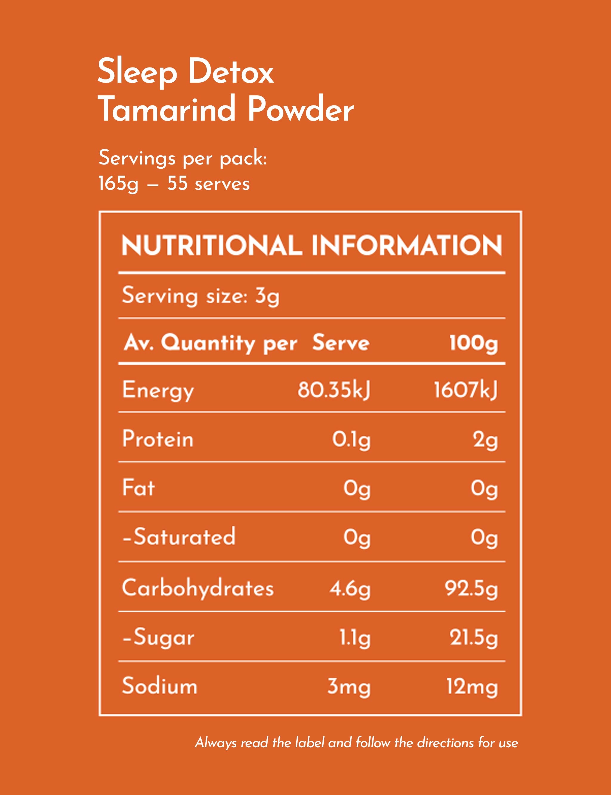 Anyone on blood thinners should not take SLEEP DETOX Tamarind Powder. Outside of this, SLEEP DETOX is all–natural and contains nothing artificial. We are unable to provide exact advice on whether it is safe to consume whilst taking other specific medications. As everyone’s situation is different, we recommend that you check with your healthcare professional to see if this powder would be beneficial for you. Please refer to the nutritional information & ingredients list.
