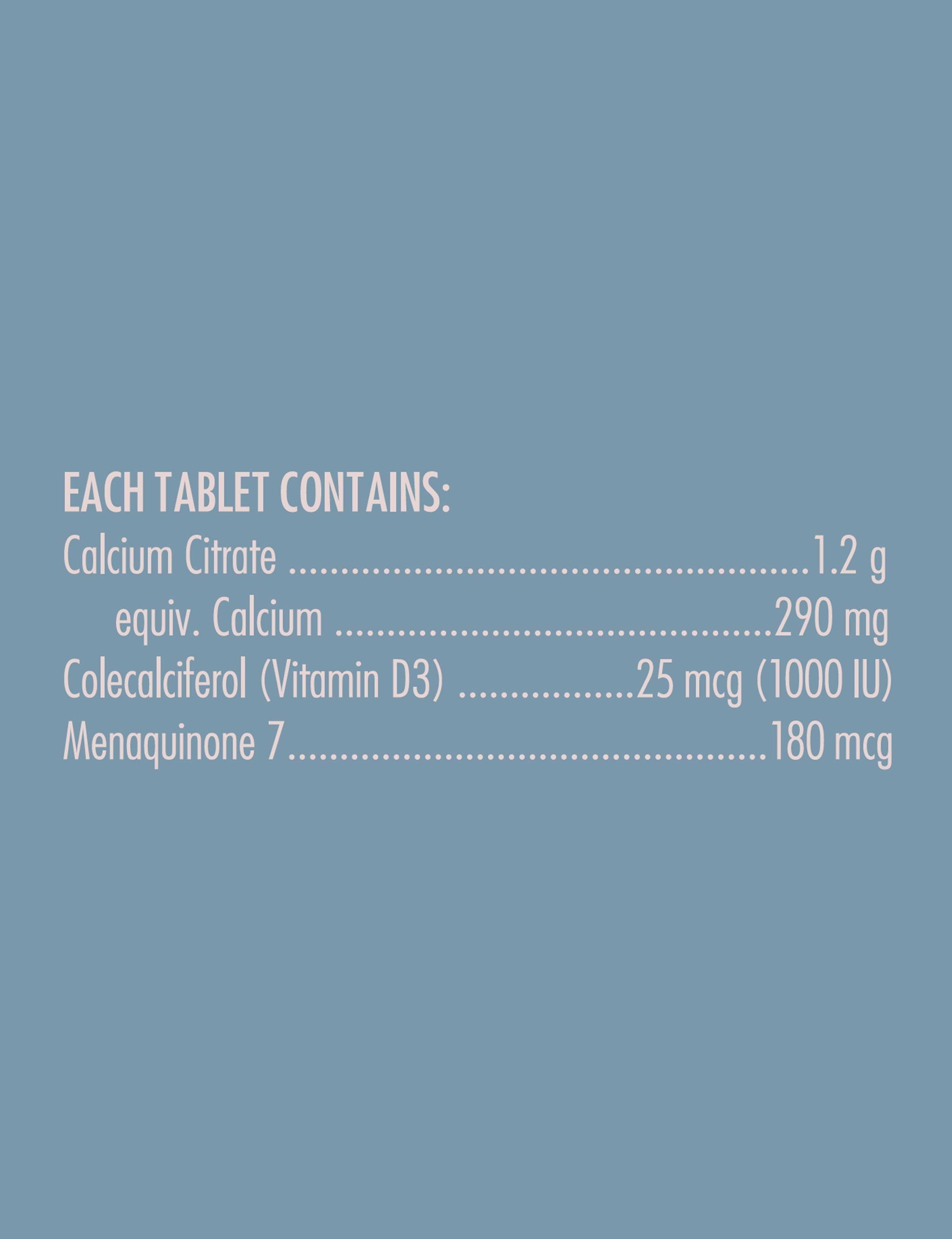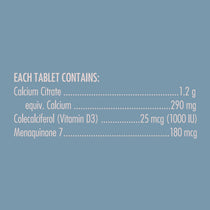 Calcium Citrate 1.2g equivalent Calcium 290mg; Colecalciferol (Vitamin D3) 25mcg (1000IU); Menaquinone 7 (Vitamin K2) 180 mcg. Contains sulfites.