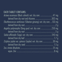 Actaea racemosa root (Black cohosh) extract dry concentrate 47 mg, derived from dry root and rhizome 302 mg; Eleutherococcus senticosus (Siberian ginseng) extract dry concentrate 133 mg, derived from dry root 2 g; Angelica polymorpha (Dong quai) extract dry concentrate 250 mg, derived from dry root 5 g; Salvia officinalis (Sage) extract dry concentrate 243 mg, derived from dry leaf 1.7 g; Ziziphus jujuba var. spinosa (Jujube) extract dry concentrate 30 mg, derived from dry seed 1.5g; Zinc citrate dihydrate 25 mg, equivalent Zinc 8 mg.