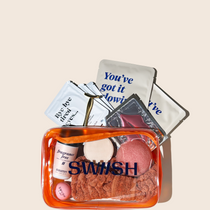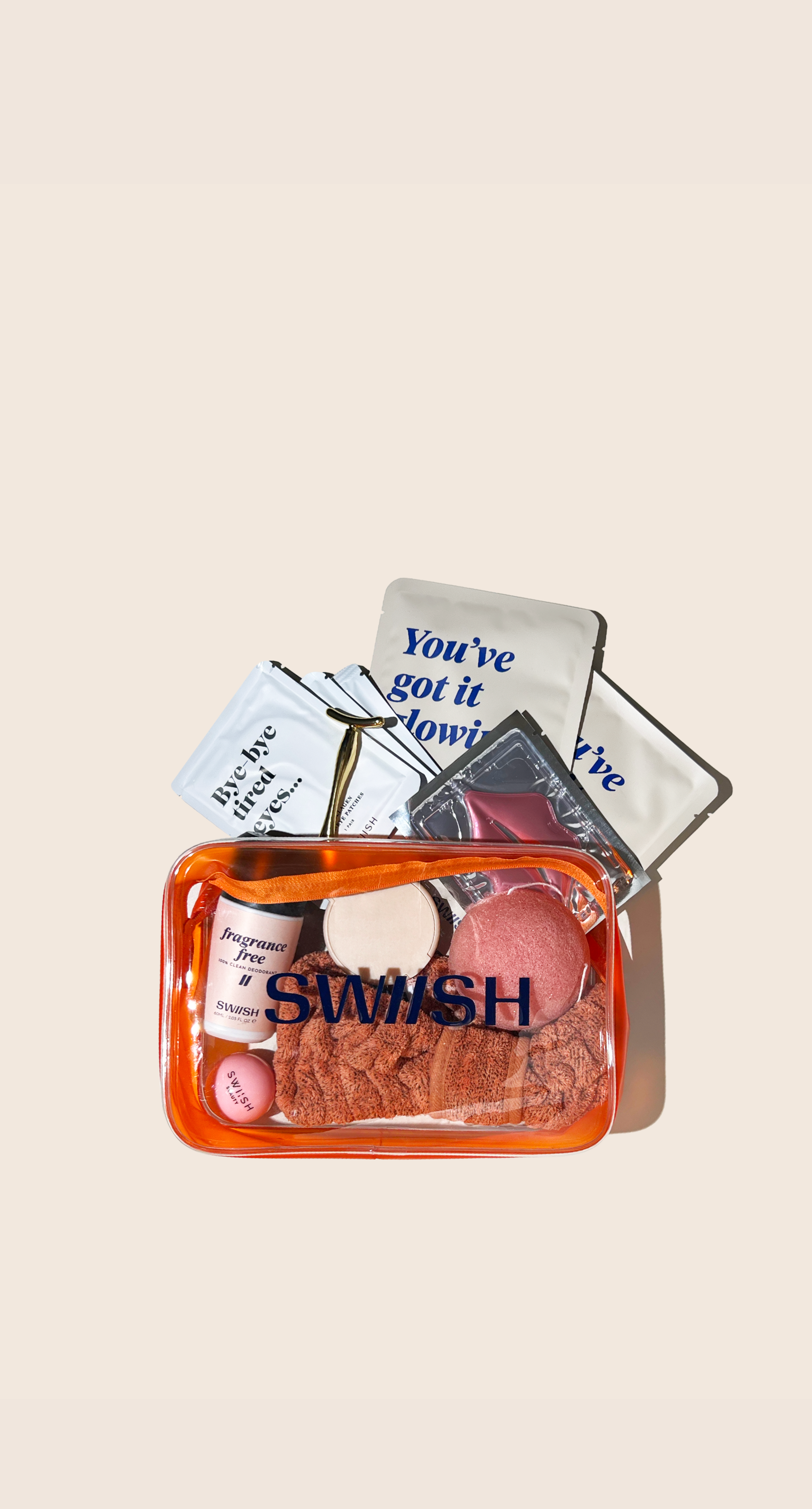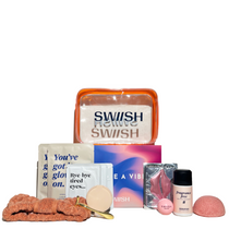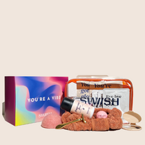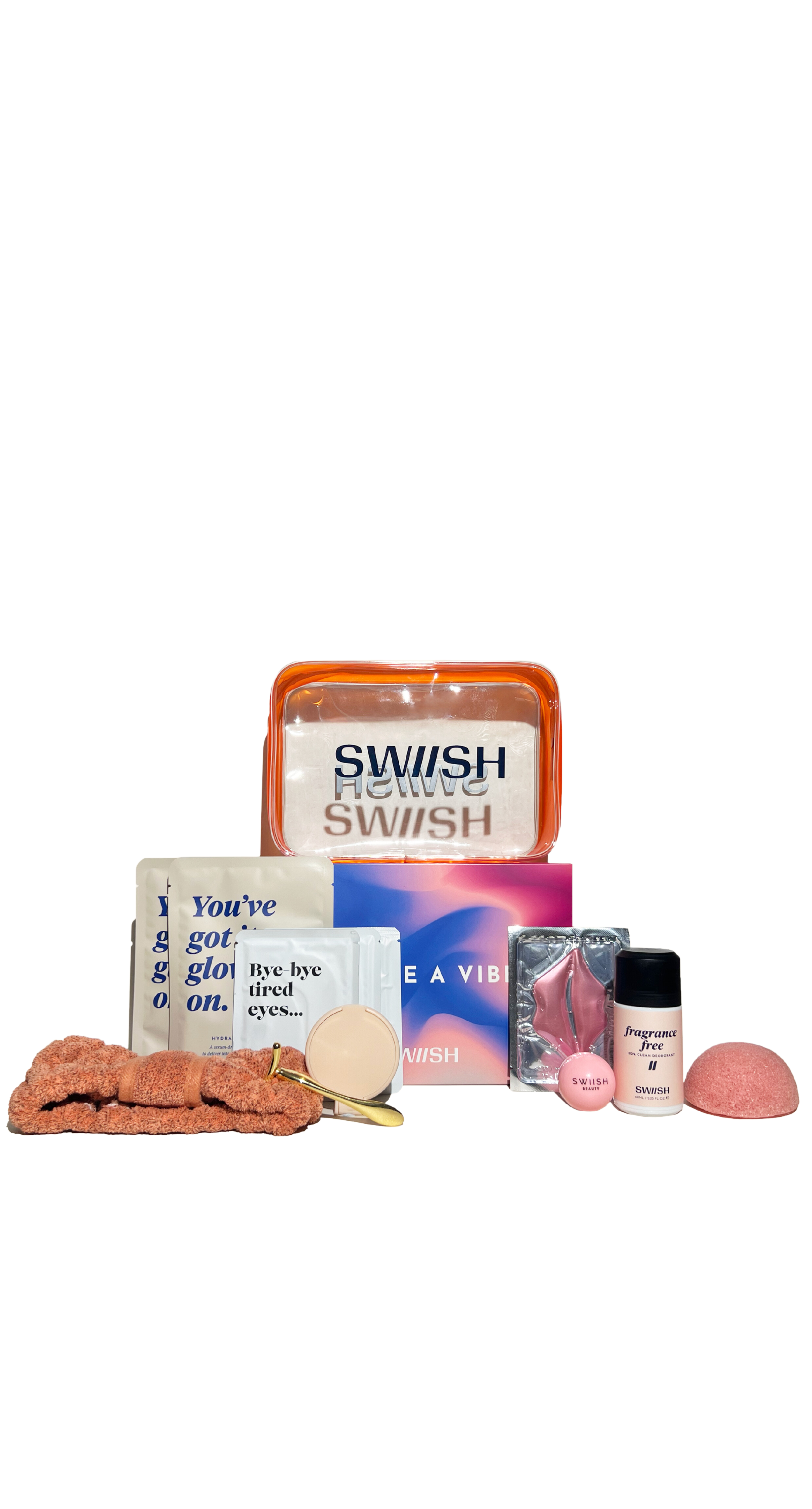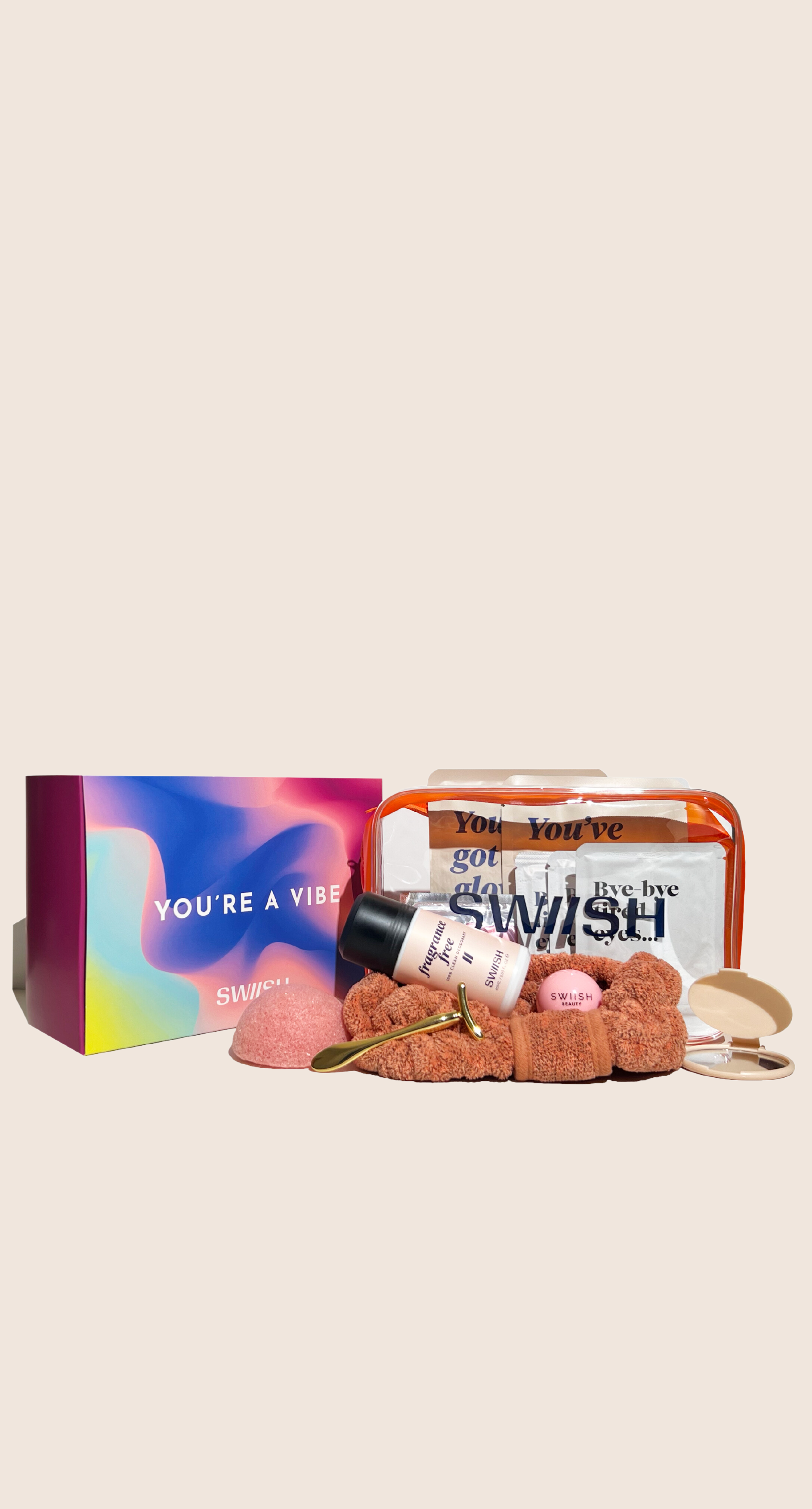 Includes: SWIISH Makeup Bag; Facial Headband; Deodorant Fragrance Free; Glow Getter Sheet Masks; Collagen Under Eye Masks; Hydrating Lip Mask; Compact Mirror; Head Massager; Gold Mini T-Bar Face Roller; Packed in a You’re a Vibe Gift Box.