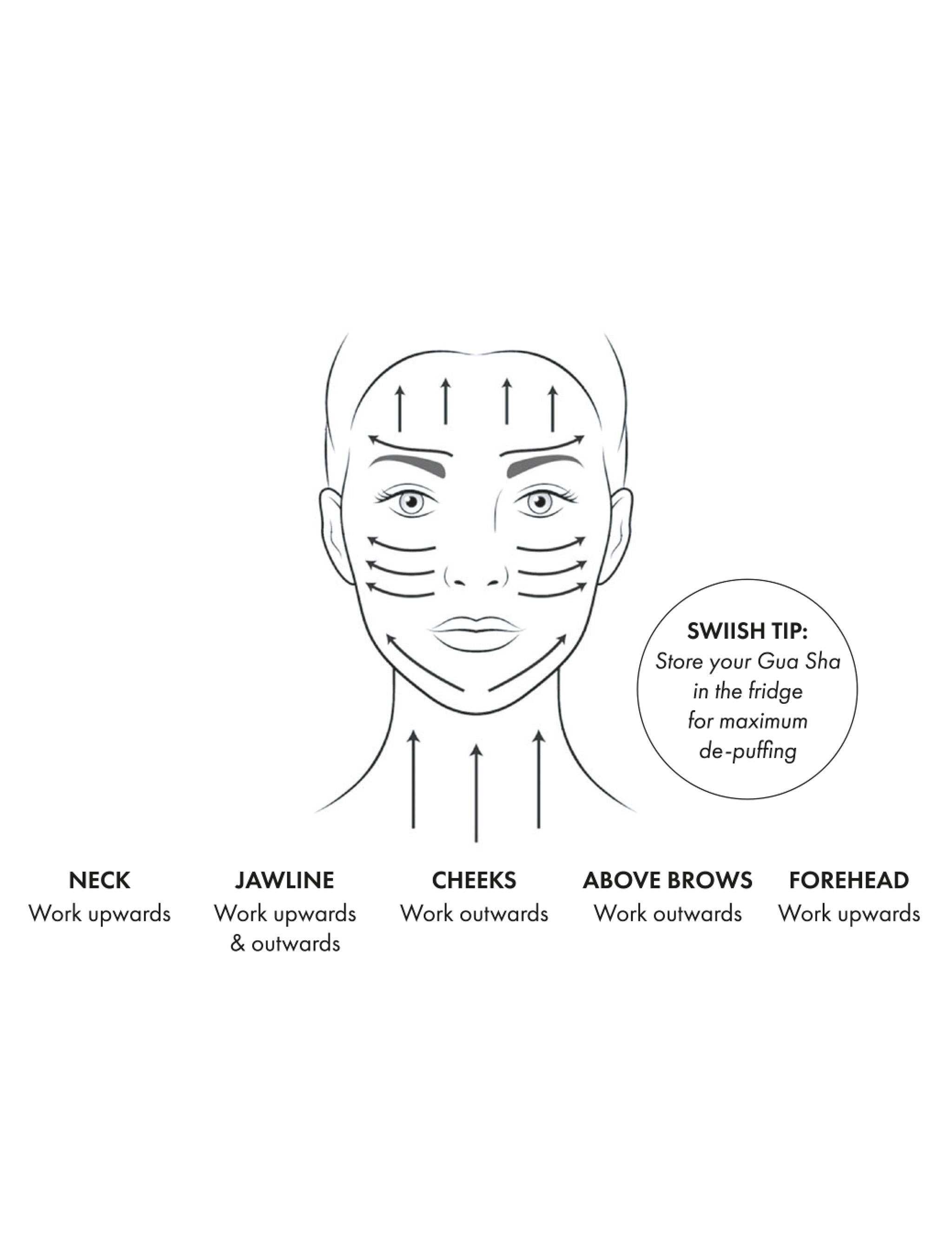 3. Start with the neck, jawline, chin and around the mouth, gliding the Gua Sha along the skin in smooth motions, 3-5 times per area.