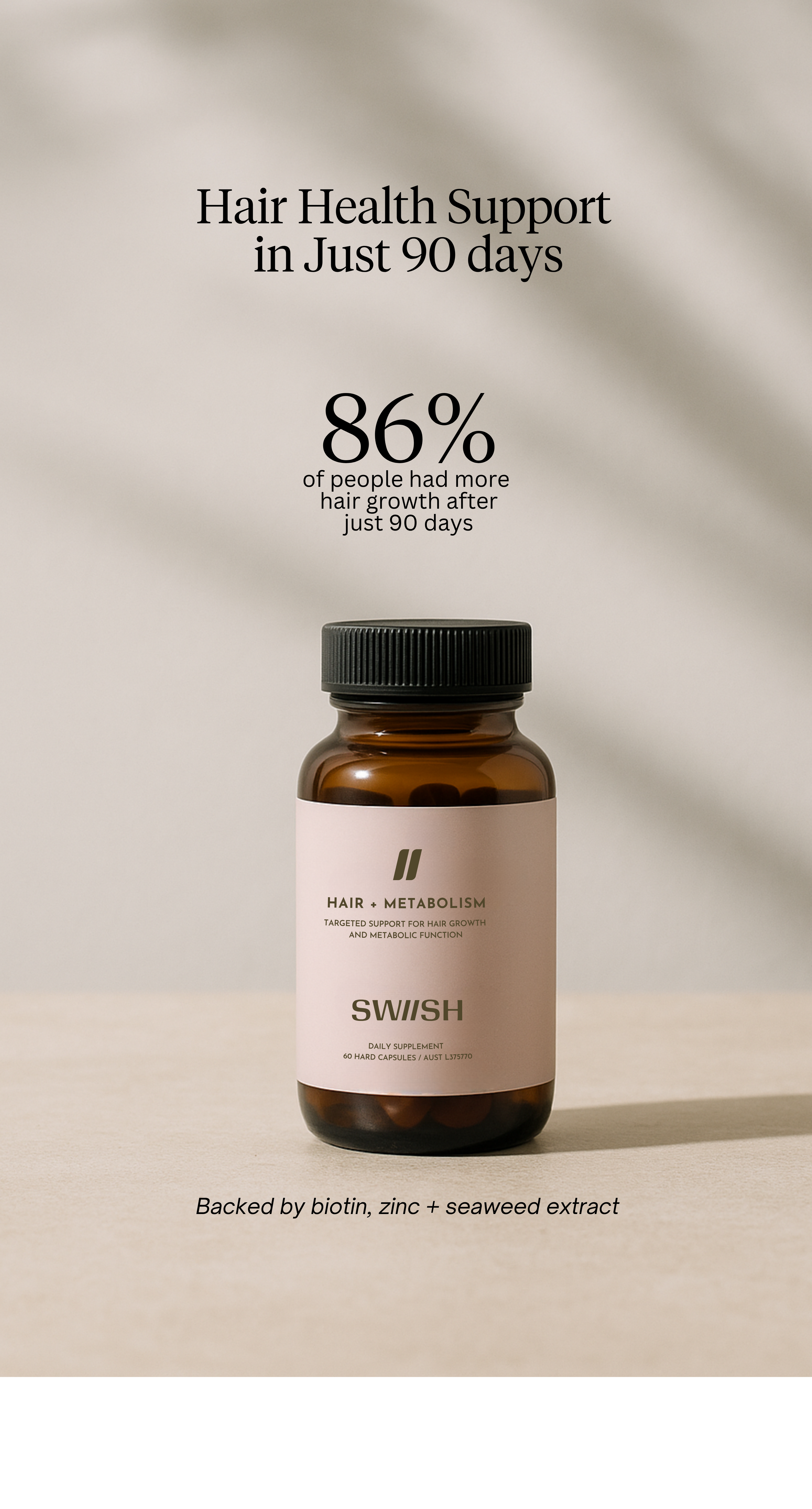 HAIR + METABOLISM: Take 1 capsule once daily with water, or as directed by your healthcare professional. Always read the label and warnings before use. Do not use if pregnant, breastfeeding or likely to become pregnant. Those with thyroid conditions should consult their health professional prior to using Hair + Metabolism.