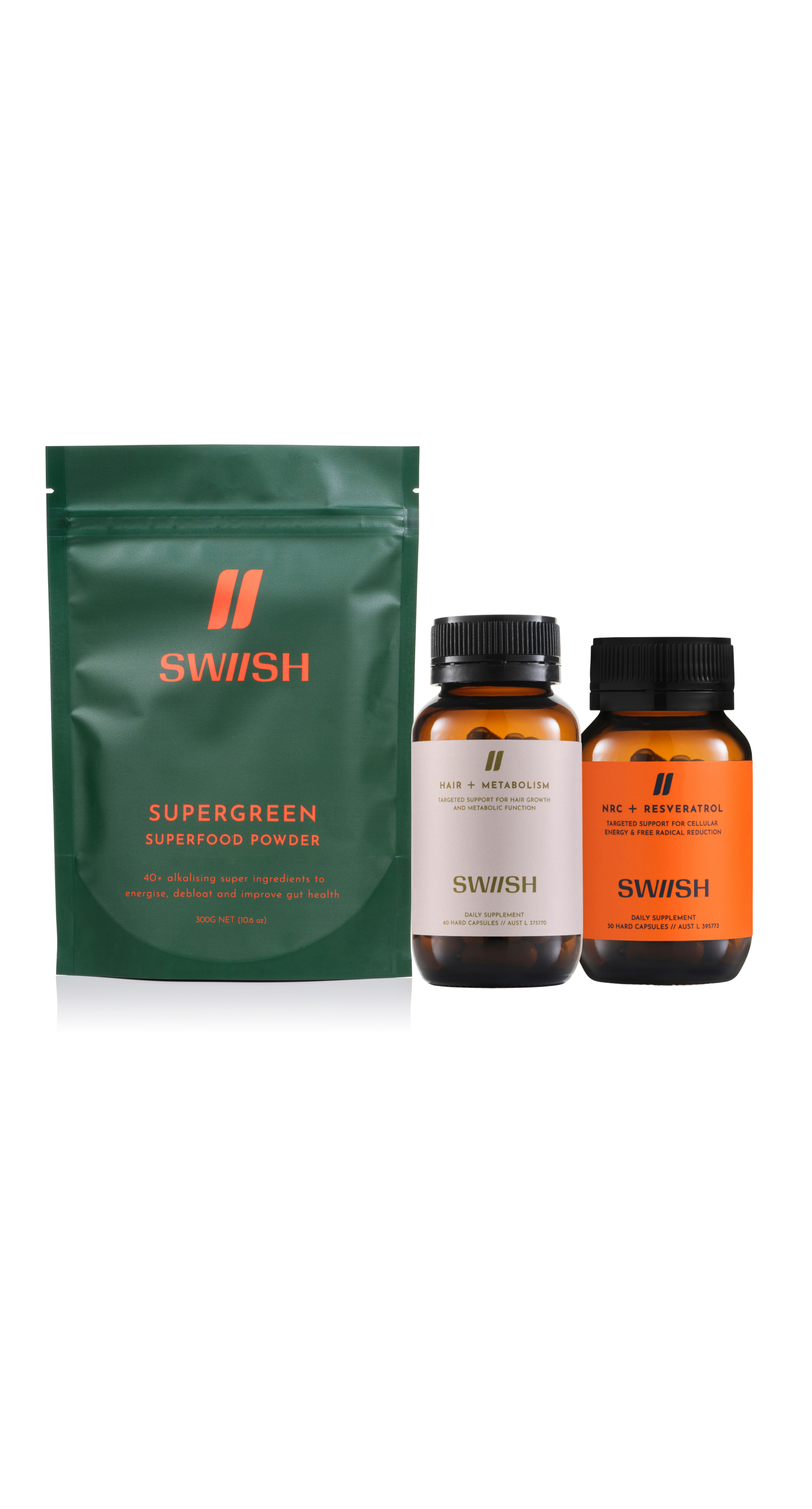 Includes: 1 x SUPERGREEN Superfood Powder (300g), 1x NRC + RESVERATROL (30 Capsules), 1x HAIR + METABOLISM (60 Capsules)