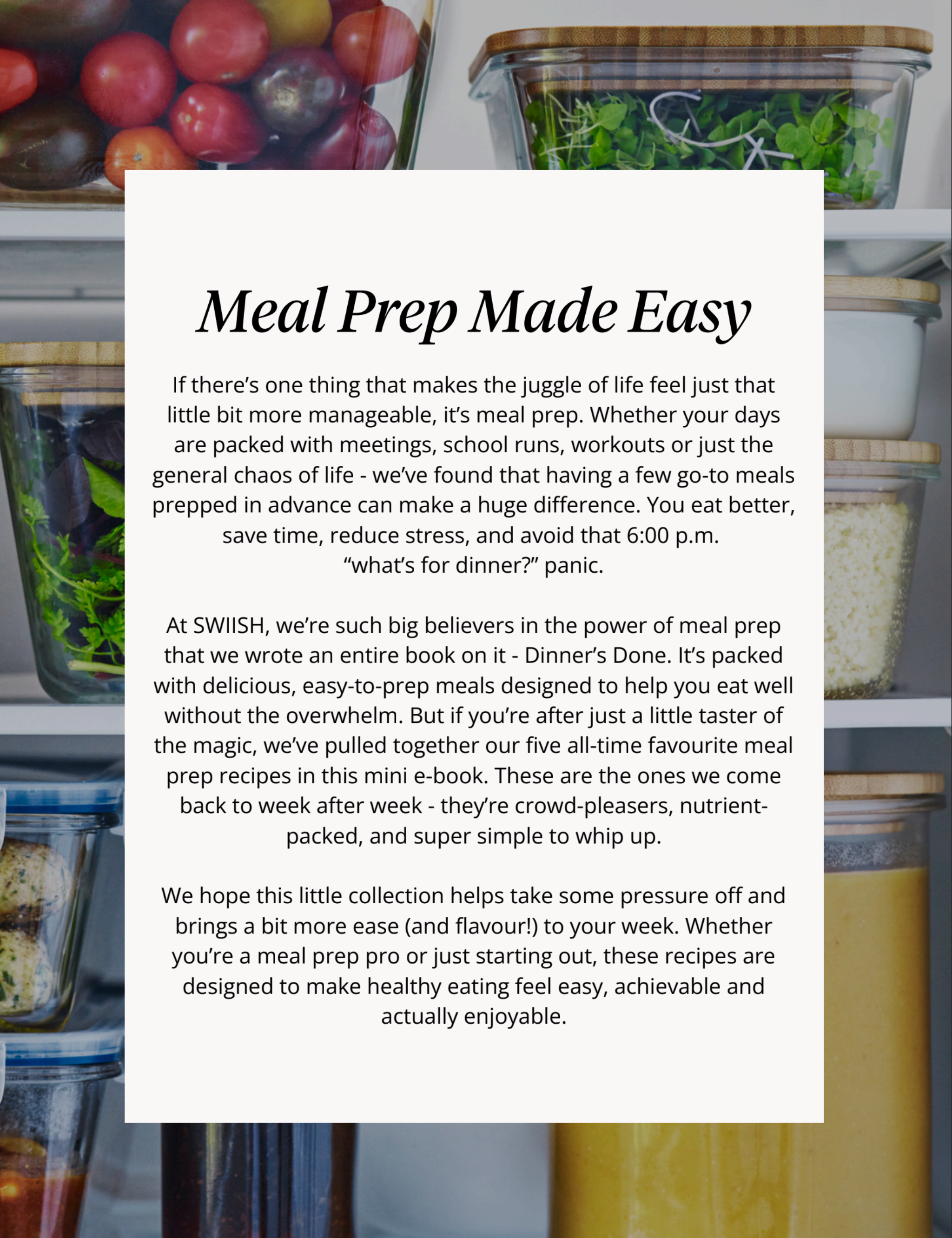 Meal prep is a game-changer for making busy lives feel more manageable - helping you eat better, save time and reduce stress. This mini e-book includes our five favourite go-to-recipes; simple, nutritious, and perfect for any week. Whether you're a meal prep expert or just beginning, these dishes are designed to make healthy eating easy and enjoyable.