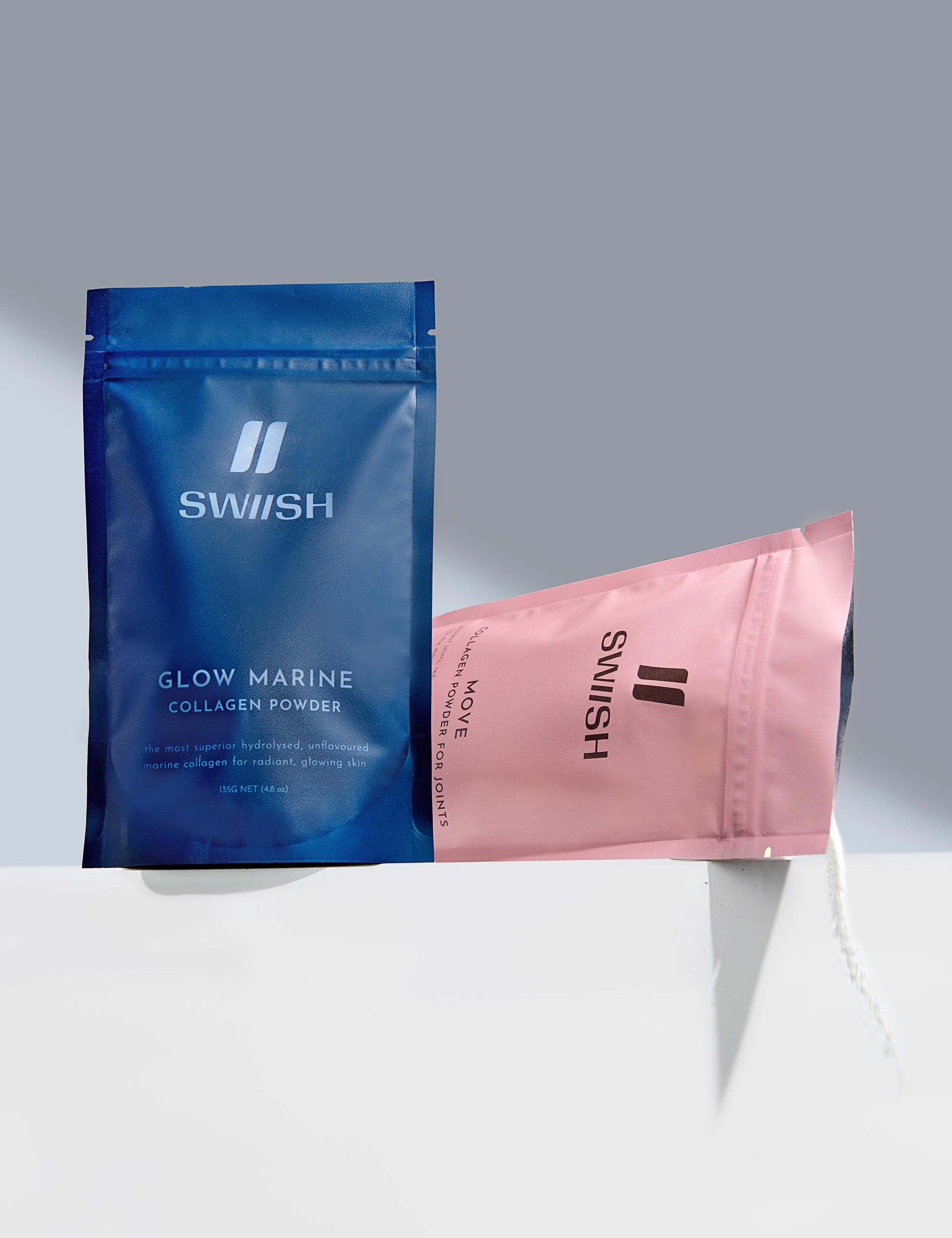 Includes: GLOW Marine Collagen Powder 135g; MOVE Collagen Powder For Joints 110g